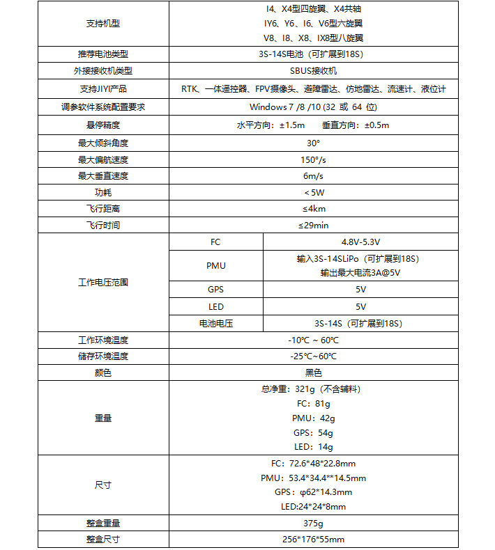 目录 搜索 K++V2飞控使用手册注意事项免责声明产品清单飞控套装基础参数硬件安装说明 K++v2主控安装GPS模块安装机架类型设置软件调试调参软件下载连接调参软件调参软件简介基础功能设置高级功能设置app调试飞防管家app下载连接飞防管家app飞防管家调参简介遥控器校准界面参数设置界面扩展模块界面高级设置界面基础设置感度其他喷洒设置仿地雷达关于界面飞行测试遥控器功能介绍飞行模式介绍高级功能介绍手机地面站使用说明KML文件导入附录1 LED三色灯指示状态附录2 极翼技术支持 暂无相关搜索结果! 飞控套装基础参数 基础参数